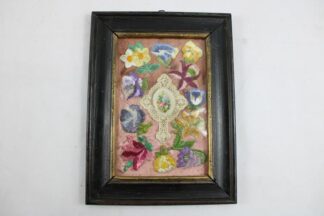 0437-Klosterarbeit mit Blumenstickereien u. Spitzenkreuz um 1900