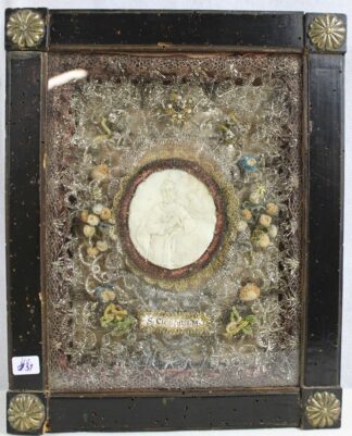 0438-Klosterarbeit mit Hausenblasen Relief und Reliquie süddeutsch 19 Jh.