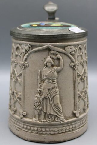 0543-Modelkrug 1/2 L. braun glasiert mit Porzellanscheibe Walhalla um 1900