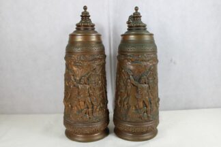 0549-Paar 3 L Steinzeug Krüge kupferummantelt 19 Jh.