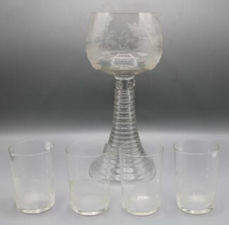0772-Römer Gläser mit gravierten jagdlichen Motiven 5 St. 20 Jh.