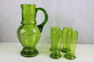 0775-Schenkkanne mit 4 Becher grünes Glas um 1900