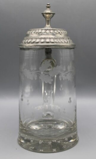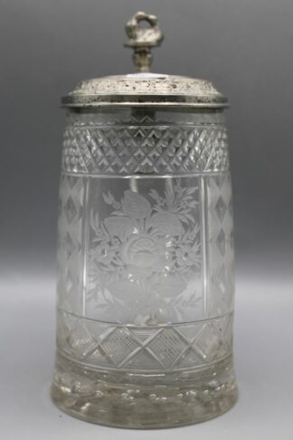 0728-Glaskrug mit Zinndeckel Gambrinus Bay. W. 19 Jh.