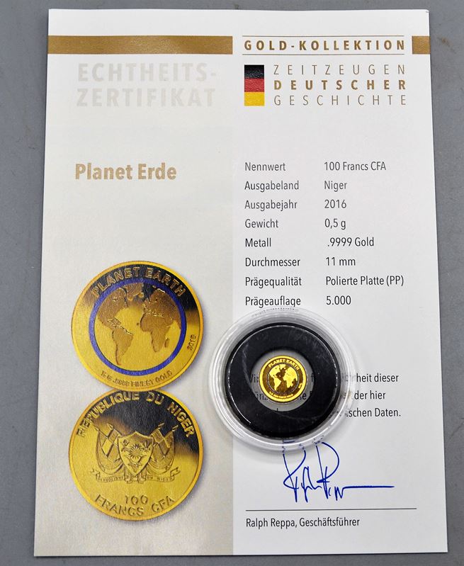 100 Francs CFA 2016 Planet Erde Goldmünze 0,5g 999 Feingold Ø 11 mm, Polierte Platte