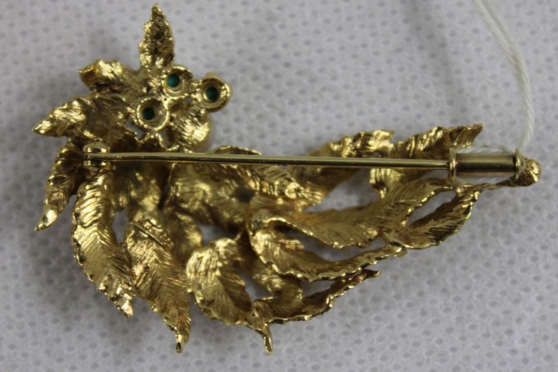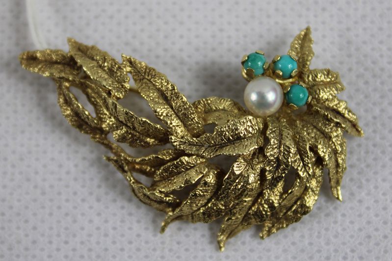 0009-Blätterbrosche 585 Gold mit Perle u. kleinen Türkisen