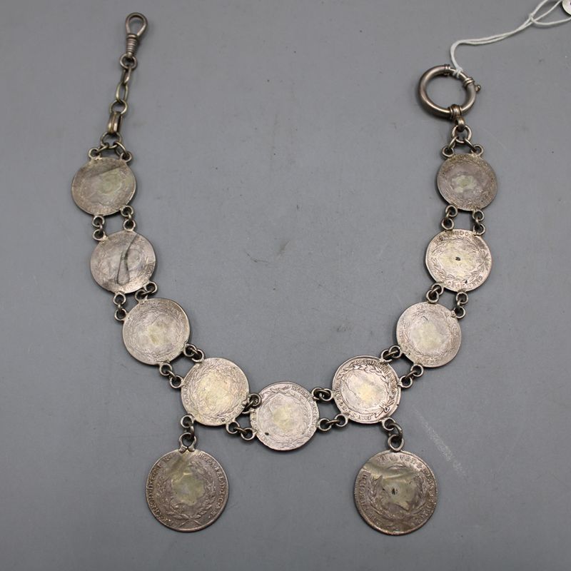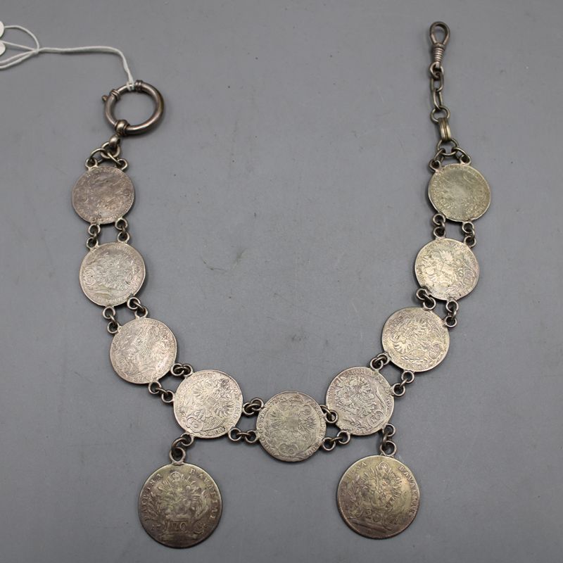 Kette 800er Silber, 10 u. 20 Kreuzer Silbermünzen aus Österreich/Bayern 18 Jh. (Münzen mit Knopfspuren), Länge ca. 38 cm, 64,8 g