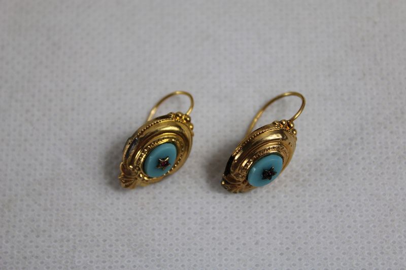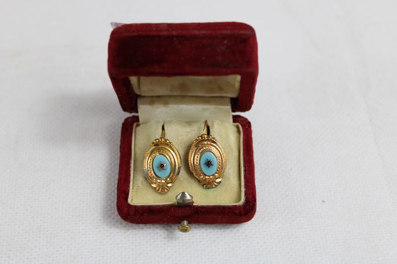 Schaumgold gefüllt, kleine Reparaturstellen (1 Bügel ersetzt mit 333 Gold), kleine Beschädigungen, ca. 18 x 12 mm, mit orig. Schachtel