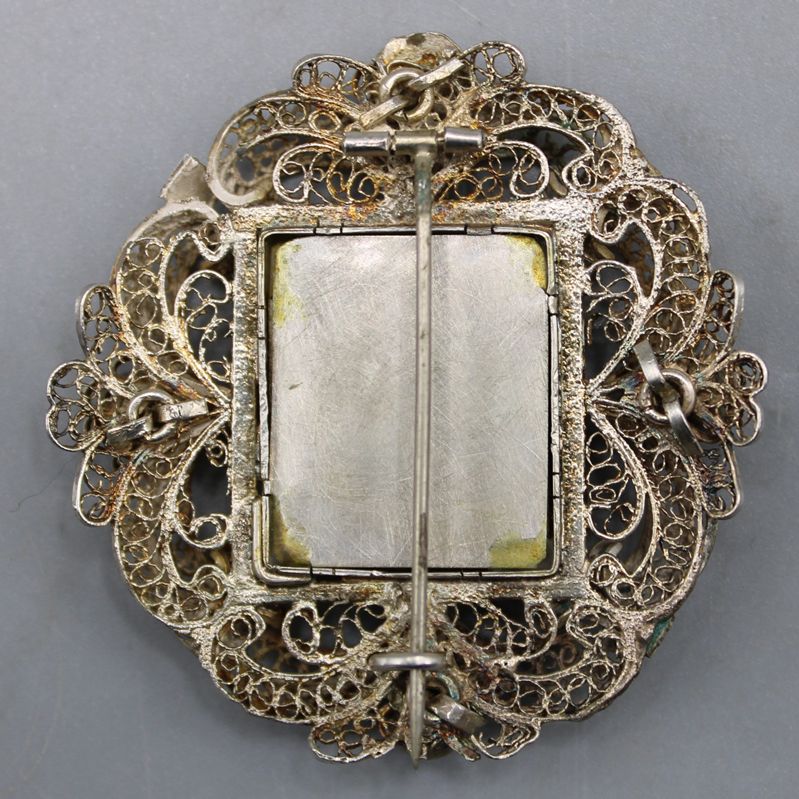 handgemaltes Miniaturbildnis, 4 rote Glassteine, filigrane Silberdrahtarbeit, ca. 5,2 x 5 cm, 16,7 g