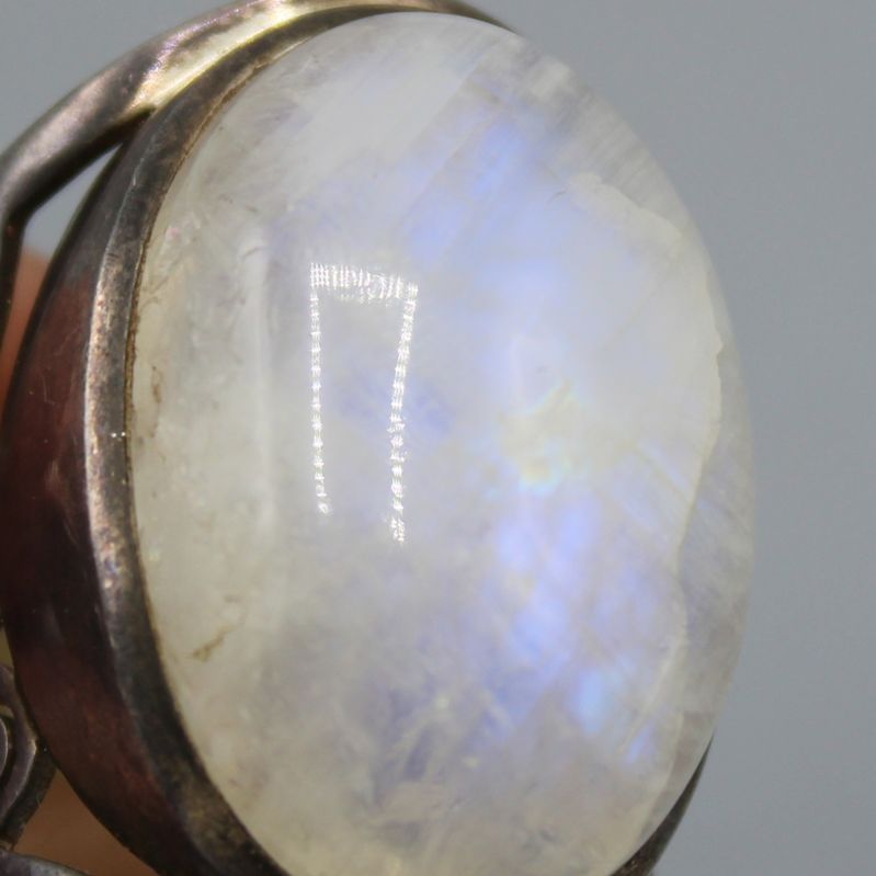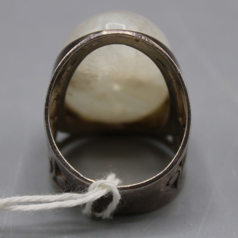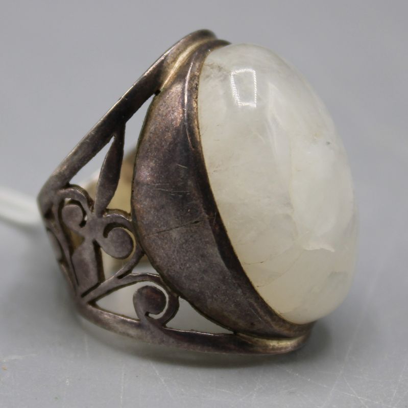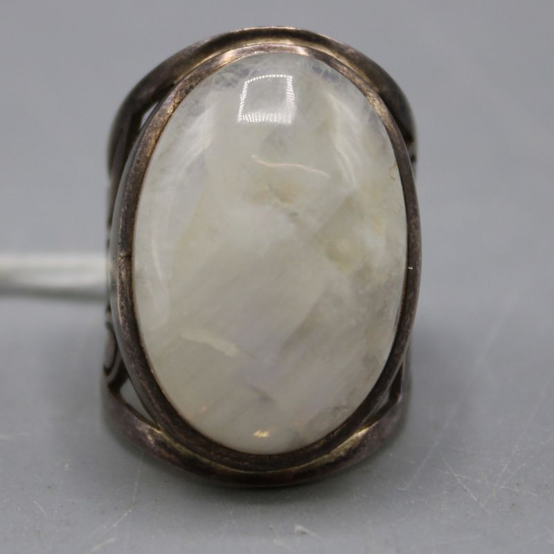 durchbrochene Ringschiene mit handgesägten Verzierungen, Mondstein ca. 2,6 x 1,8 cm, Ring Ø 18,5 mm, 15,4 g