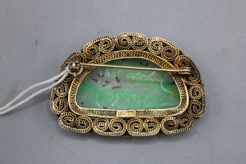 Geschnitzte Jade Brosche mit Silberfiligran wohl China 20 Jh.