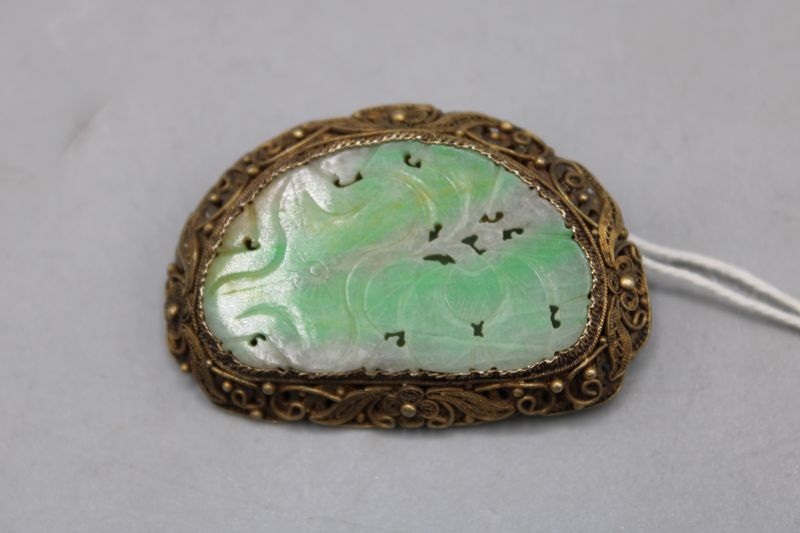 0040-Geschnitzte Jade Brosche mit Silberfiligran wohl China 20 Jh.