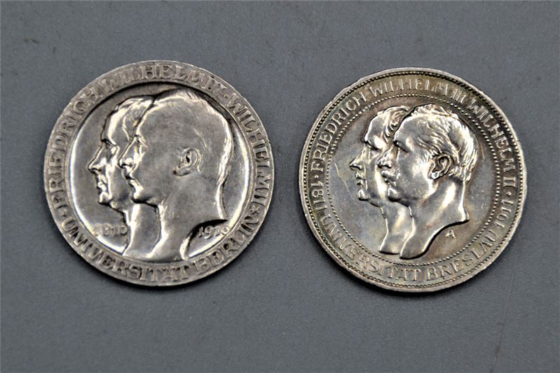 3 Mark 1910 A Universität Berlin u. 3 Mark 1911 A Universität Breslau Preußen, Friedrich Wilhelm III. u. Friedrich Wilhelm II.