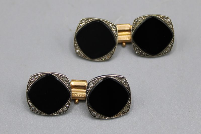 Onyx umrandet von kleinen Diamantrosen in Platin gefasst ca. 13 x 13 mm, Verbindungsstück 750 Gelbgold mit Adlerkopf Punze Frankreich u. Patentvermerk " BREVETE S.G.D.G", zus. 11,7 g