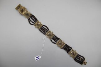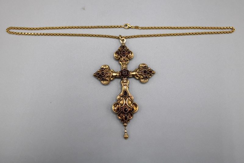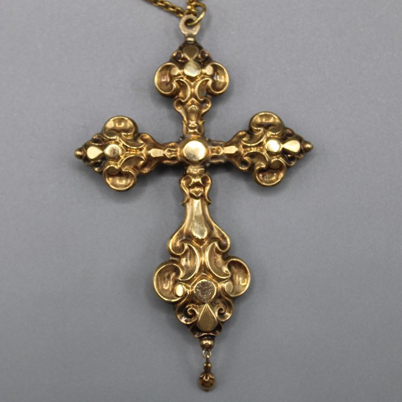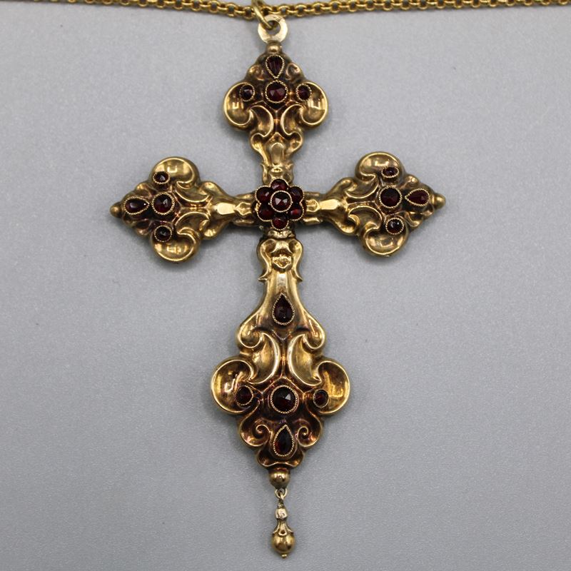 Kreuz Anhänger mit Granatrosen besetzt ca. 9 cm 585 Gold 17,8 g 19 Jh., Erbskette ca. 44,5 cm 9,5 g (Kette stammt aus dem 20/21 Jh.)