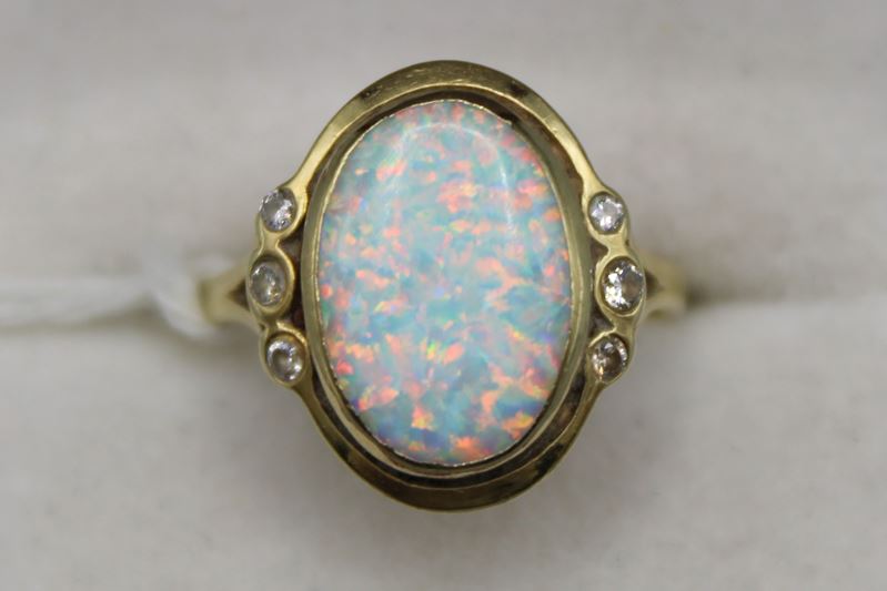 0083-Opalring 585 Gold seitlich mit 6 kl. Diamanten