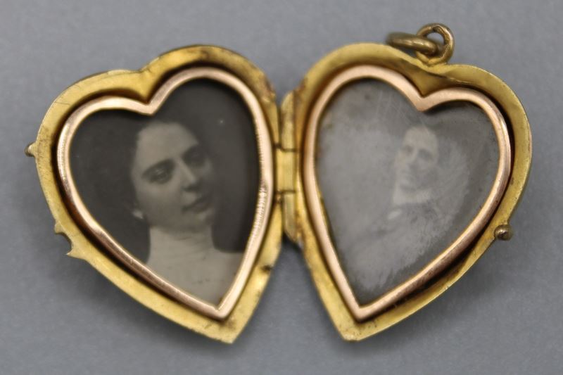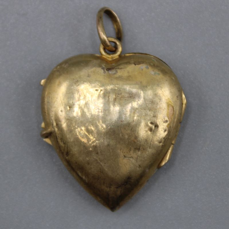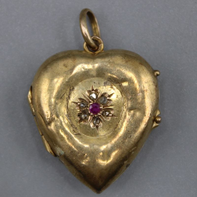 Vorderseite mit Blüte aus kleinem Rubin u. Diamanten, ca. 22,3 x 21,1 mm, 3,2 g, Altersspuren/kl. Dellen