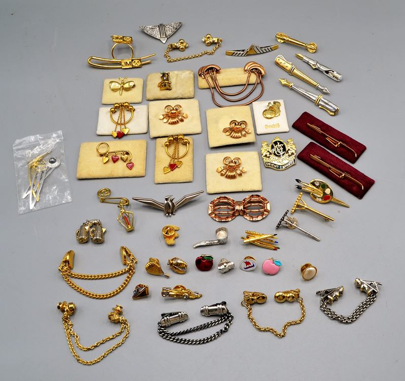 Modeschmuck Broschen Anstecker Krawattenklammer etc. Konvolut ca. 48 St., viele vergoldet, viele unbenutzt