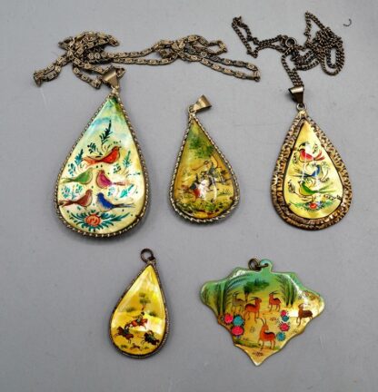 0106-Miniaturmalerei Perlmutt Lackmalerei Broschen Anhänger Dosen Fedoskino Russland 16 St.