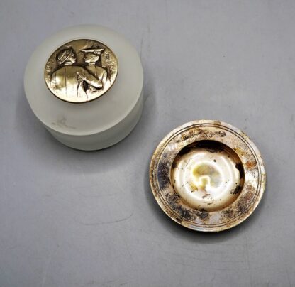 Silber Objekte Konvolut 2-teilig, Glasdöschen Ø 8,4 cm Italien mit 925 Silber Reliefbild im Deckel, kleines Schälchen London Sterling Silber 2. H. 20 Jh. Ø 8,2 cm 47,3 g