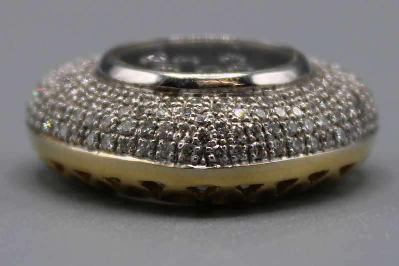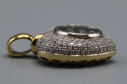 Vorderseite komplett mit kleinen Brillanten besetzt, mittig bewegliche Brillanten hinter Glas, 3,7 x 2,8 cm, 18,6 g