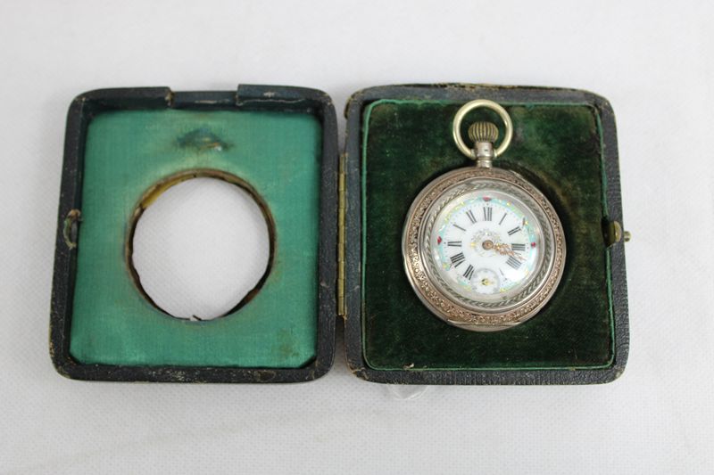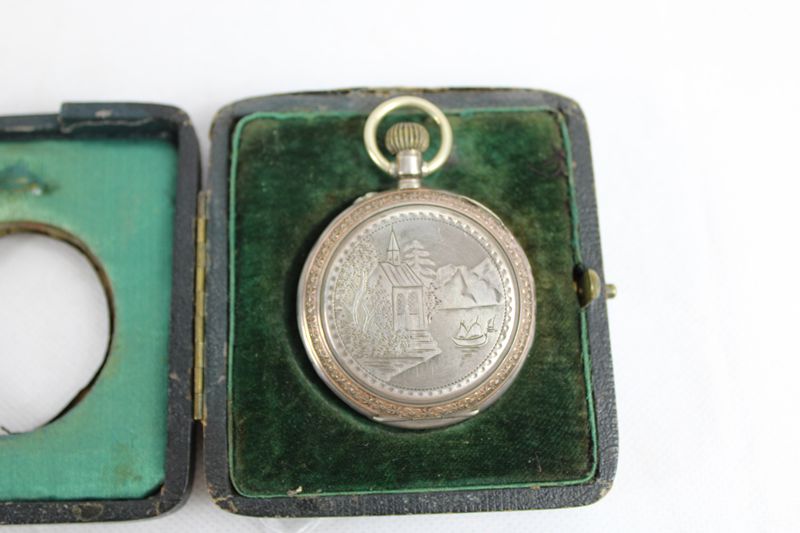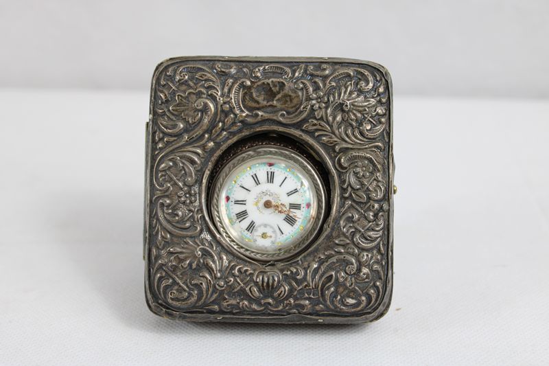 mit fein reliefierter Sterling Silberplatte, dazu Taschenuhr mit gravierten Werk u. Deckel (die Uhr läuft an, Ganggenauigkeit u. Laufdauer nicht geprüft) Ziffernblatt min. beschädigt, Ständer ca. 9 x 8,5 cm