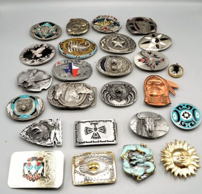 Gürtelschnallen Buckles Konvolut 24 St., verschieden, u. a. Indianerdekore, teils emailliert