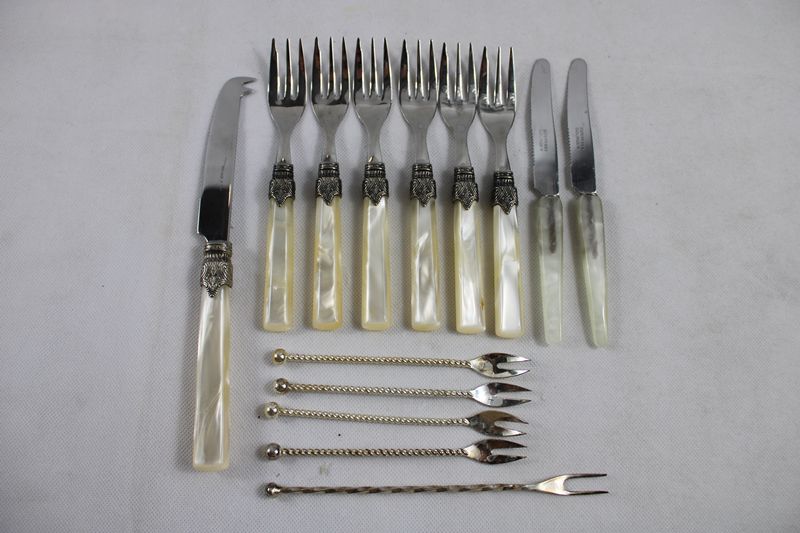 0141-Besteck Perlmuttgriffe 9 Teile u. 5 Spieße Konvolut