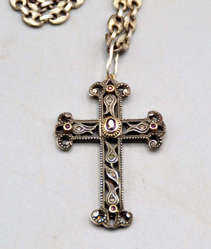 Kreuz Anhänger Gold 585 mit Silber Rubine u. Diamanten, hochwertige alte Goldschmiedearbeit, hintere Deckplatte aus 585 Gold, vorne Silber mit Rubinen (Gold gefasst) u. kleinen Diamanten ca. 5 x 3,2 cm 9,2 g, mit Silberkette 925 ca. 60 cm 22,8 g