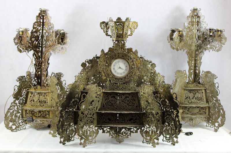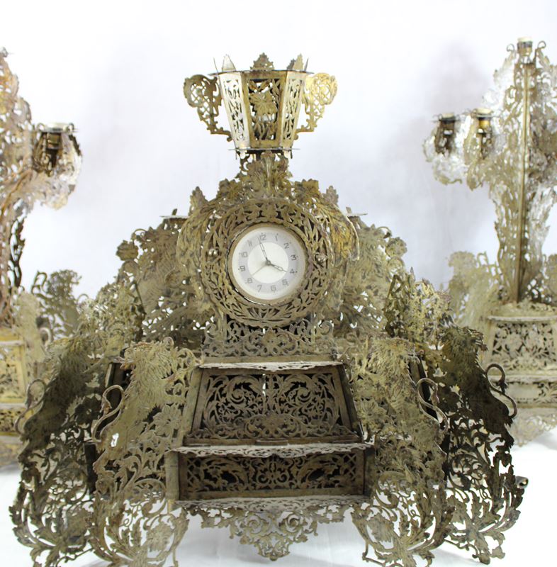 Filigran gearbeitete Eisenblech Kaminuhr mit Leuchtern Mitte 20 Jh.