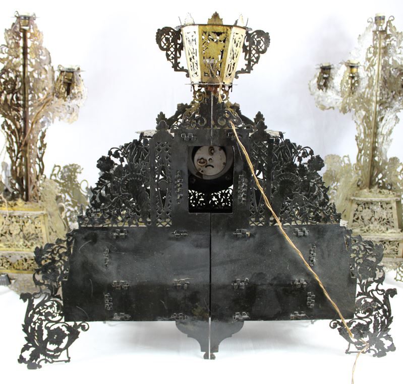 0154-Filigran gearbeitete Eisenblech Kaminuhr mit Leuchtern Mitte 20 Jh.