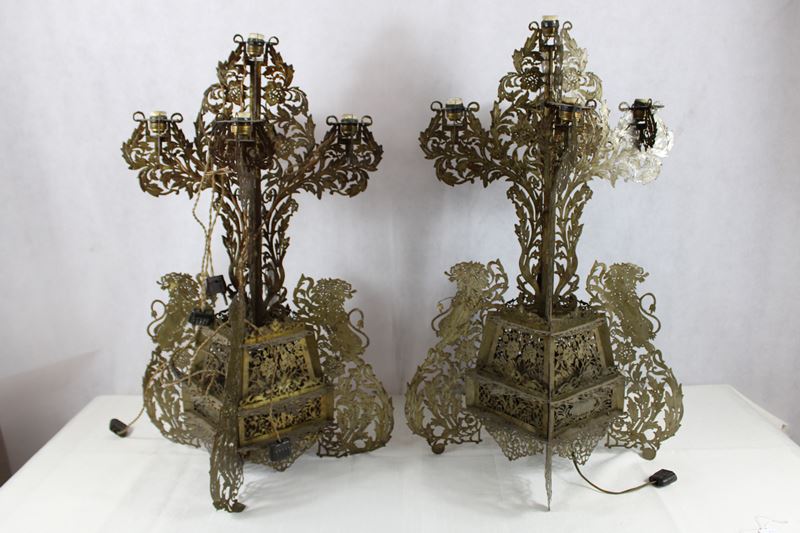 aufwendigste Handarbeit, aus Eisenblech gearbeitete Rankenornamente und Löwen, Uhr und Leuchter für Glühbirnen elektrifiziert (ungetestet, vom Fachmann prüfen lassen), Weckeruhrwerk (läuft nicht an), Kaminuhr Höhe ca. 58 cm, Breite ca. 64 m, Leuchter ca. 62 cm, tlw. kl. Beschädigungen, vereinzelt fehlen kl. Ornamente, kein Paketversand!