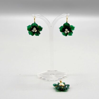 Jade Perlen Blüten Schmuckset 750 Gold, 1 Anhänger, Paar Ohrringe (1 Ohrring beschädigt), Ø Blüten ca. 23,5 mm, Gesamtgewicht 11,7 g