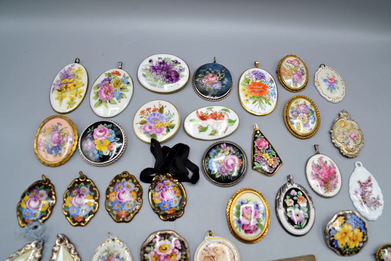 Porzellan Broschen Anhänger etc. Konvolut ca. 60 St., darunter Tirschenreuth Bareuther Limoges Schumann Hutschenreuther Lindner Küps Wunsiedel etc., viele handbemalt, vereinzelt mit Silberfassung, vereinzelt signiert