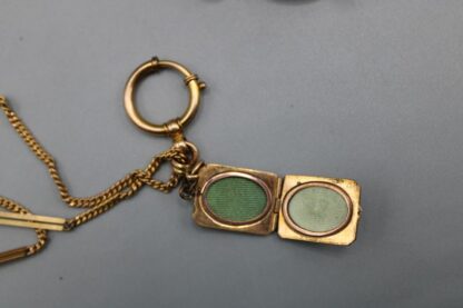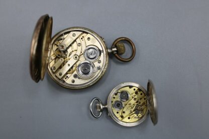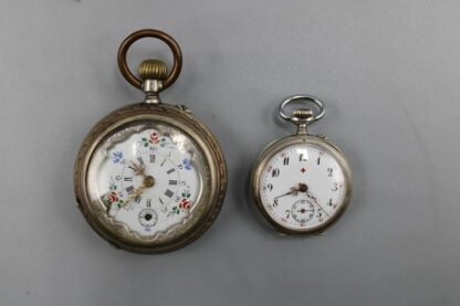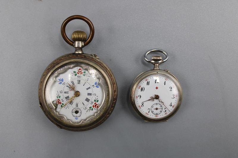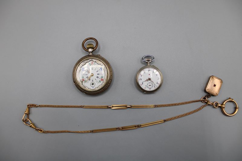 Rotes Kreuz Damen Taschenuhr Ø 31,5 mm (beide Deckel Silber), Taschenuhr Ø 45,4 mm Ziffernblatt beschädigt Sekundenzeiger fehlt (1 Deckel Silber), beide Uhren laufen an (Ganggenauigkeit u. Laufdauer nicht geprüft), Taschenuhrkette mit Medaillon vergoldet
