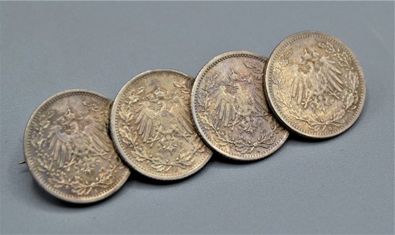 Münzbrosche Trachtenschmuck 1/2 Mark Silber Brosche mit 4 Silbermünzen Deutsches Reich ca. 6,4cm 12,1g
