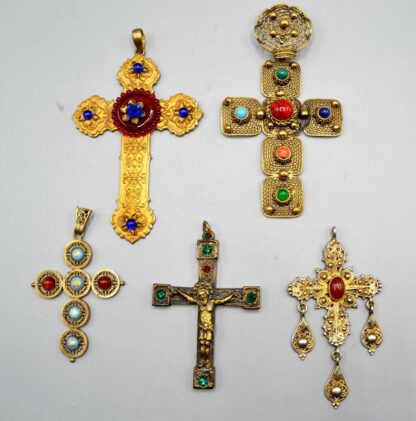 Kreuz Anhänger alt 5 St., mit Glas- u. Edelsteinen besetzt