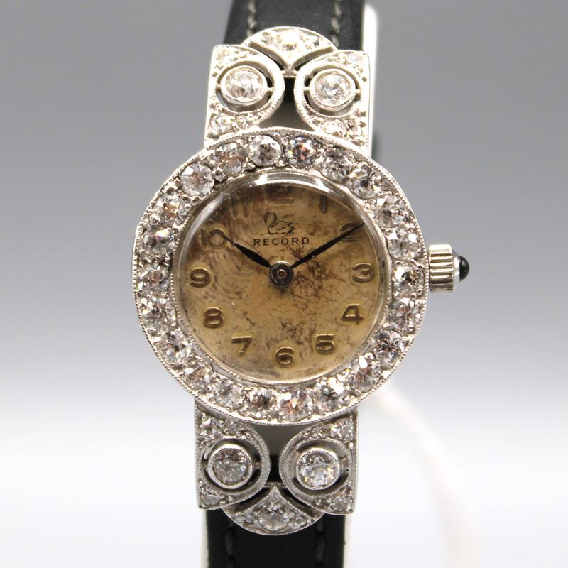 Art Deco Record Damenuhr Platin m. 44 Altschliff Diamanten, auf Quarzwerk umgebaut (ungetestet!), Ziffernblatt Altersspuren, 44 Altschliff Diamanten zus. ca. 2 ct., Gehäuse Ø ca. 21,6 mm (ohne Krone)