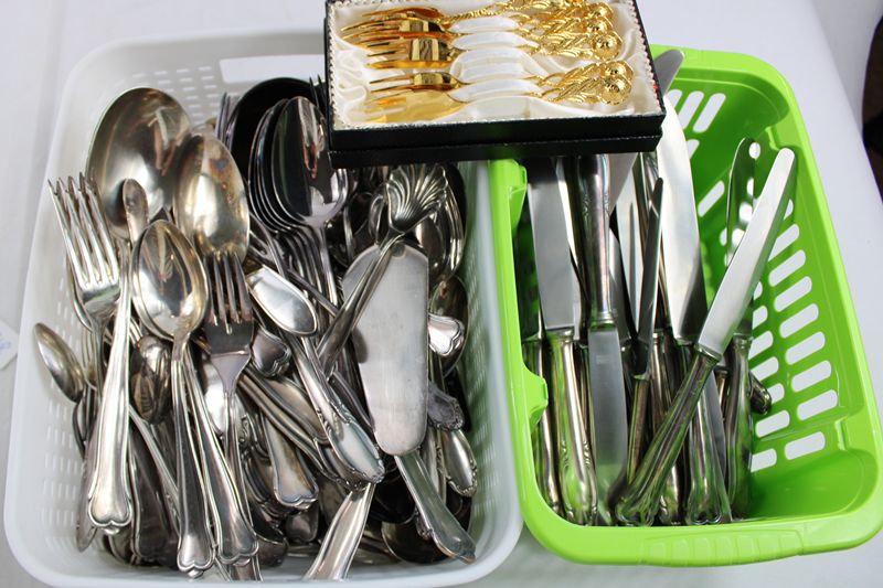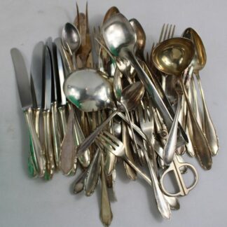 darunter ca. 6,7 kg Löffel Gabeln etc., ca. 2,1 kg Messer etc., überwiegend 90er Versilberung
