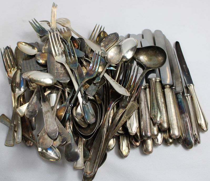 Löffel Gabeln etc. ca. 3,2 kg, Messer Serviettenringe ca. 1,7 kg, überwiegend 90 er Versilberung