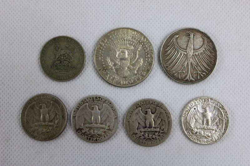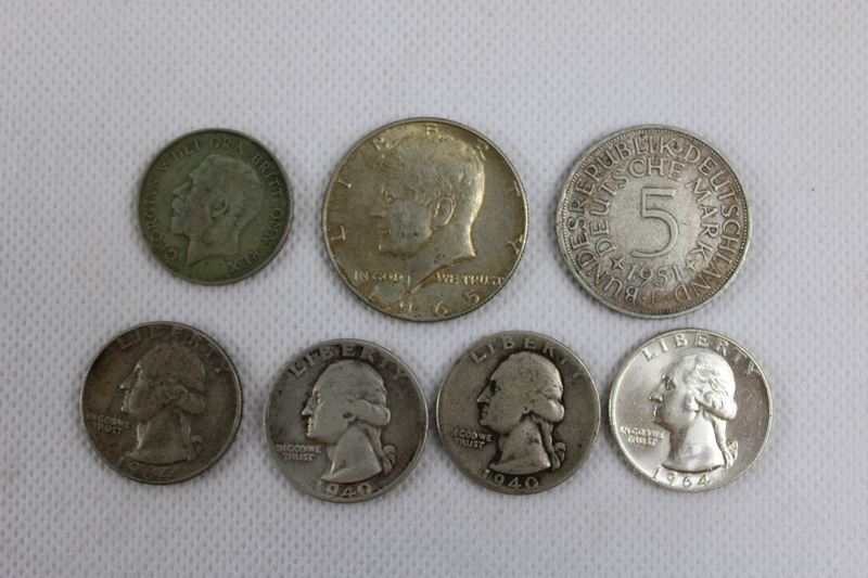 darunter Half Dollar 1965, 4 x Quarter Dollar, 5 DM 1951 F, One Shilling 1922