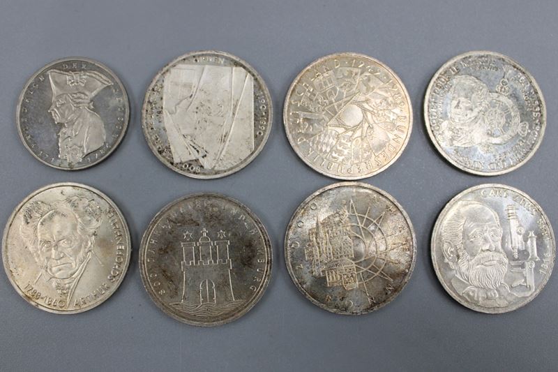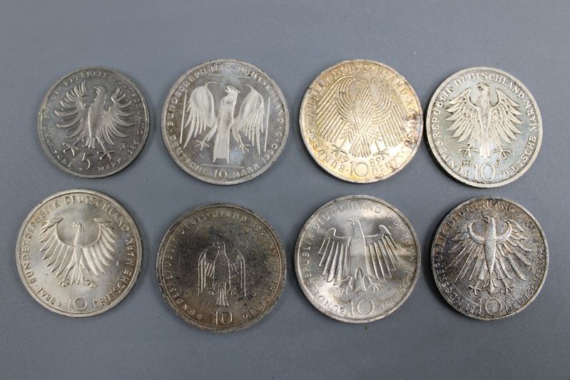 7 x 10 DM Silbermünzen, 1 x 5 DM (Ku-Ni)