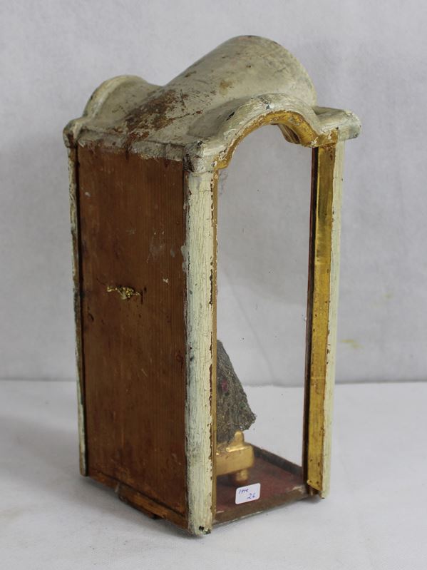 Reich ausstaffiertes Lorettokindl im verglasten Holzgehäuse 18/19 Jh., rarer Schmuckanhänger mit gemalter Miniatur der Altöttinger Madonna, Scheiben fehlen teilweise, ca. 26 x 14 x 9 cm
