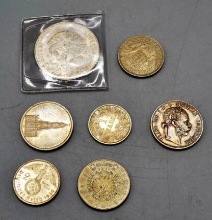 Silbermünzen Münzen Konvolut 7-teilig, darunter 1 Florin 1891 Franz Josef I, 5 Zlotych 1935, 2 Pengö 1929 Ungarn, 5 Reichsmark 1934 D, 2 Reichsmark 1939 A, 1 Mark 1915 A