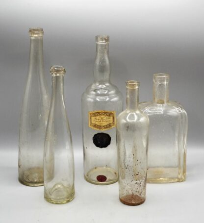 Konvolut alte Glas u. Parfüm Flaschen 19 / 20 Jhdt., darunter Russisch Henry Hummels Eau de Cologne Grossparfümerie Bavaria M. W. Kaiser München (selten), Haarwasser Flasche Behrol Gold Parfümerie Wilh. Behringer Nürnberg, Vollraths Essig Essenz, Opekta Flasche, Anton Riemerschmid Weinbrennerei Hoflieferant Münche, zwei hochgestochene Weißglas Flaschen etc.