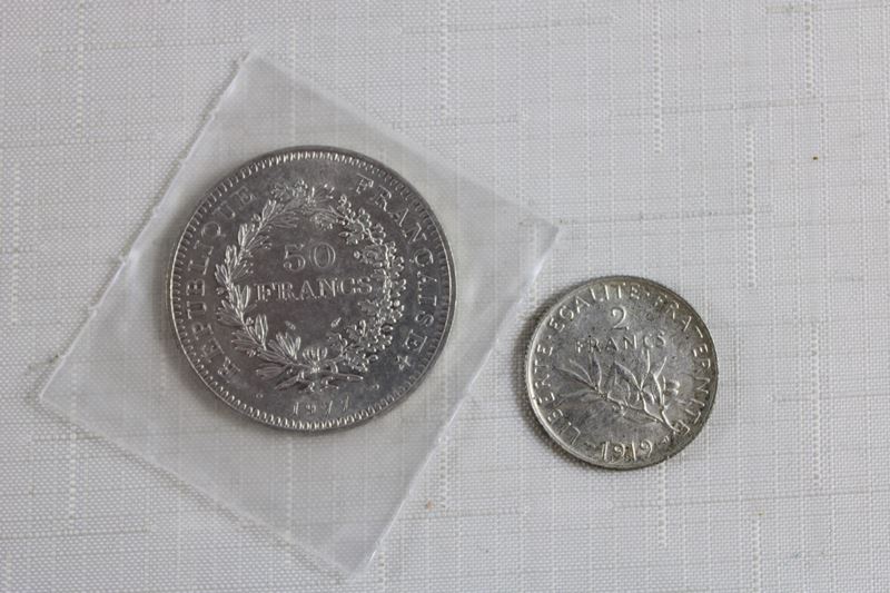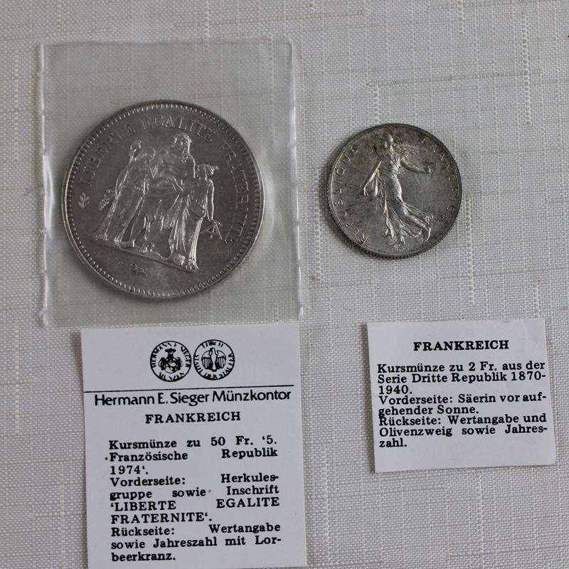 darunter 50 Francs 1977 Herkulesgruppe, 2 Francs 1919