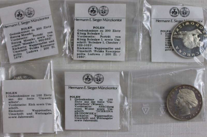 darunter 200 Zloty 1979 Mieszko, 200 Zloty 1980 Boleslaw, 100 Zloty 1978 Elch, 100 Zloty 1978 Biber, 100 Zloty 1977 Wisent, 50 Zloty 1972 Chopin