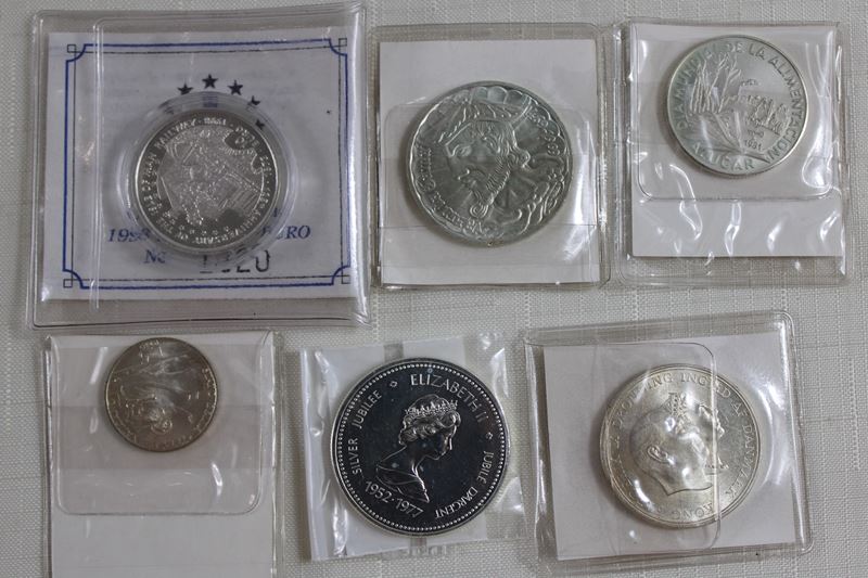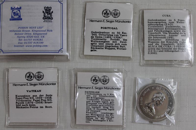 darunter 50 Escudos 1969 Portugal, 5 Pesos 1981 Cuba Welternährungstag Zuckerrohr, 10 Euro 1998 Isle of Man (kein Zahlungsmittel), 5 Kronen 1960 Dänemark, 5 Lire 1940 Vatikan, 5 Dollars 1977 Canada