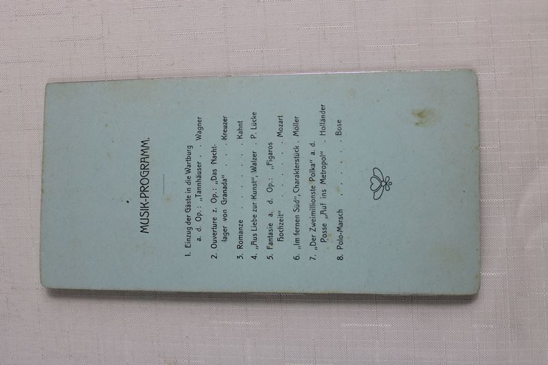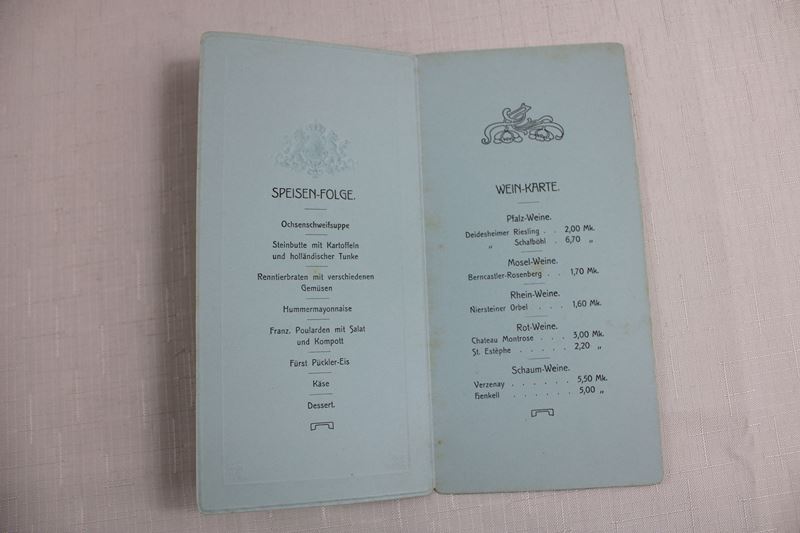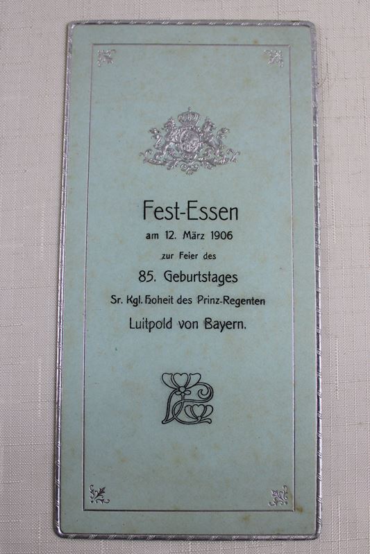 Einladungskarte zum Fest-Essen am 12. März 1906 zur Feier des 85. Geburtstages Sr. Kgl. Hoheit des Prinz-Regenten Luitpold von Bayern, Jugendstil Ornamente, eingepresstes Bayern Wappen, Speisen-Folge, Wein-Karte, Musik-Programm, leicht fleckig