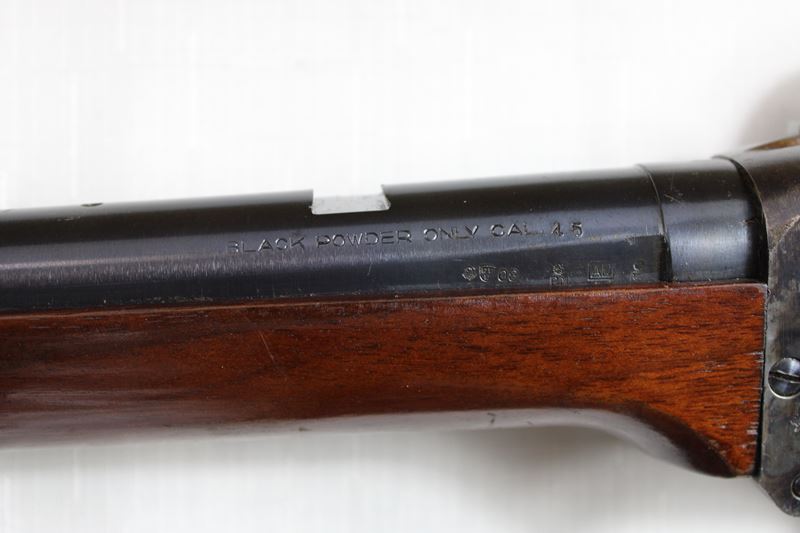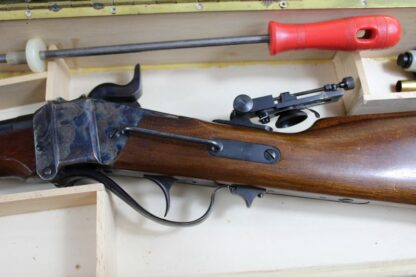 "Helbach .45/90 Perk. No. 1", "Made in Italy by Antonio Zoli & Co. Gardone V.T.", einläufige Einzelladerwaffe/Hinterlader mit Fallblockverschluss und Perkussionszündung, Länge ca. 98 cm, Helbach System für Ladehülsen .45-90, Diopter Visierung, mit 26 Ladehülsen im Lieferumfang, Ladestab, Holzbox, Abgabe nur gegen Altersnachweis!