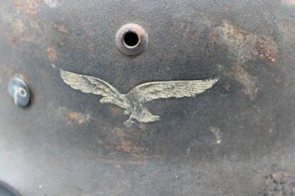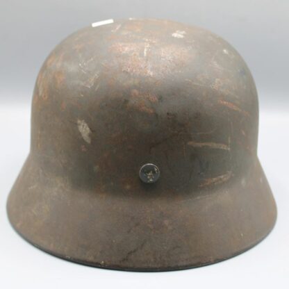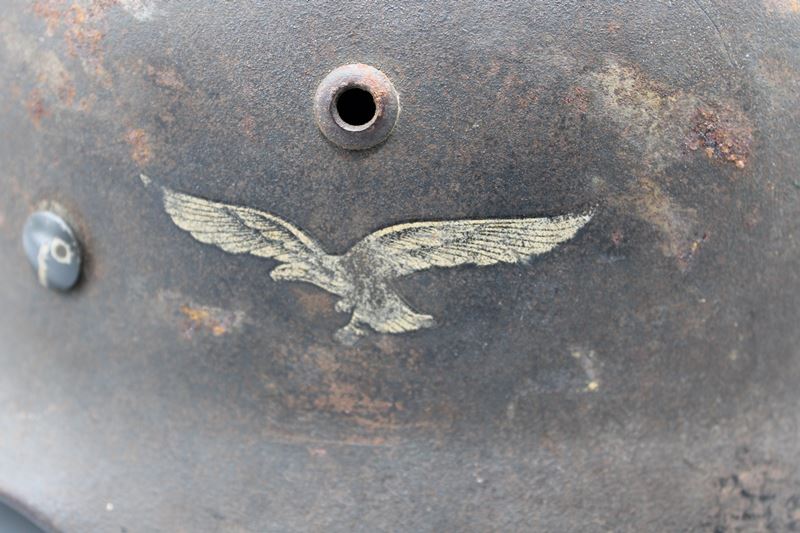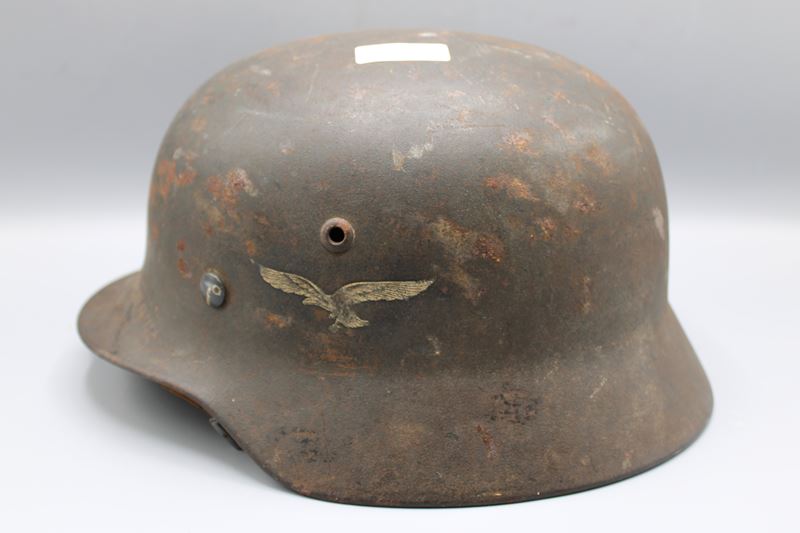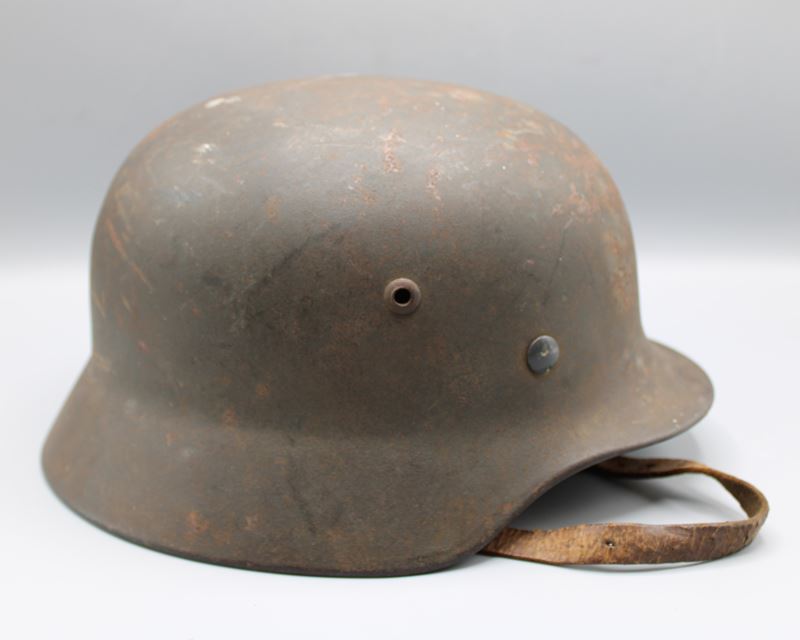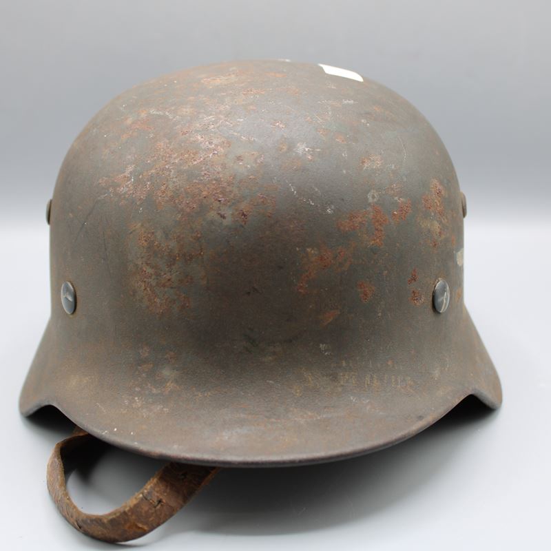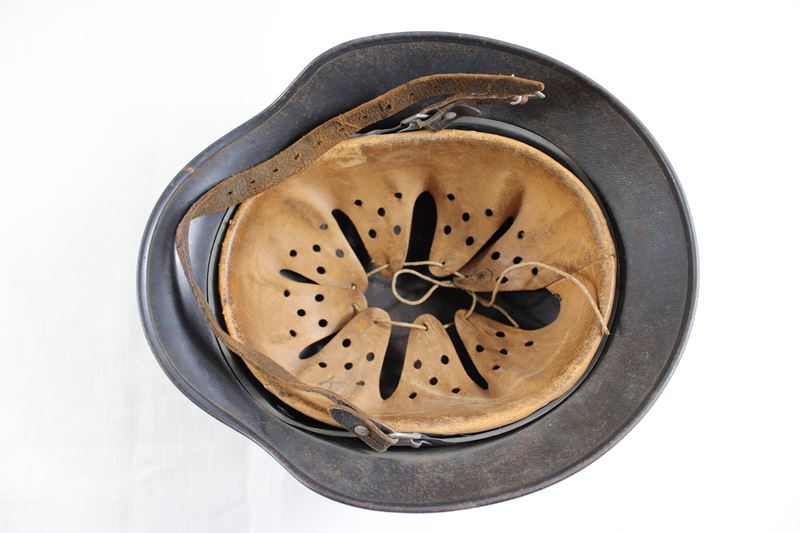 mit Innenfutter Größenstempel 58, Kinnriemen, 1 Emblem (entnazifiziert), innen seitlich eingestanzt "66", innen rückseitig eingestanzte Nummer kaum lesbar wohl "159"
